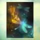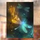 Flight of glowing, green, artistically drawn dragonfly with transparent green and yellow wings on glowing night background with marsh plants and fireflies. Glowing dragonfly.