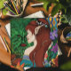 This vibrant fantasy illustration features a red-haired elf maiden with delicate pointed ears, floral hair adornments, and flowing copper hair. She stands with a mythical Green Man whose leafy face emerges from lush foliage. Surrounding them is a magical garden bursting with bold flowers, mushrooms, and swirling vines, along with a monarch butterfly adding a touch of natural whimsy. Rich colors, Celtic-inspired details, and enchanting woodland elements.