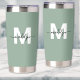 Create Your Own Stylish Modern Custom Sage Green Name Monogram Travel Mug. This cute and chic travel mug is perfect for anyone with a love for travel and a sense of personal style. The design features a soft sage green background with a bold white initial on both sides, overlaid by your name in elegant black script for a personalized touch you’ll see from any angle. With its sleek, double-sided monogram and functional design, this mug is great for sipping coffee or tea on the go—whether you're commuting, heading to class, or jet-setting across the globe. All colors can be customized to match your style. A great gift for moms, sorority sisters, best friends, or anyone who loves a little wanderlust with their morning drink!