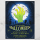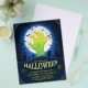 Blue & Green Halloween Club Event Party Flyer Features A Green Monster Hand, Tombs & Crosses, Moon, Spooky Trees & Spiderwebs.