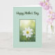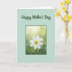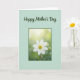 Designed with a soothing palette of gentle greens, this Mother’s Day card opens on a pale mint background that feels calm and caring ❤️. Across the upper portion, the words “Happy Mother’s Day” appear in a flowing, elegant lettering style in deep forest green, centered and easy to read. Below the greeting, a centered rectangular inset draws the eye like a framed keepsake, edged with a thin deep green border. Inside the inset is a close-up photo of a white flower with six smooth petals, arranged neatly around a warm yellow center that glows like sunlight. The soft, blurred background mixes green and golden tones, like light filtering through leaves, creating a quiet, affectionate atmosphere 🌼. To the side of the open bloom, a smaller bud sits tightly closed, adding a gentle sense of closeness and care within the scene. The inset photo is bordered by a crisp deep green line against the pale mint card front.