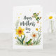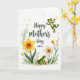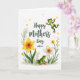 Designed with a bright white background, this Mother’s Day illustration centers on a flowing dark green message that reads “Happy Mother’s Day with love,” placed prominently in the middle. Around the words, spring-like greenery and flowers frame the scene, making the note feel like it’s nestled in a garden. Two small emerald-green frogs add charm: one perches low among leaves as if keeping watch, while the other arcs through the upper right like it’s hopping over to join its companion ❤️. Their red-orange eyes and matching toe pads echo the warm tones in the blooms, creating a gentle, affectionate connection between the two. In the lower half, trumpet-shaped flowers open wide, with a large yellow bloom on the left and a soft white bloom on the right, both surrounded by layered green foliage and tiny yellow florets 🌼. A light moss-green wash sits behind the plants to ground the arrangement. Small golden star-like specks are scattered across the open white space, especially near the top and around the lettering.