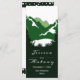 Green mountains and conifer trees ceremony and party wedding menu card. An elegant wedding design featuring a mountain range through conifers and your names in handwritten style. The back includes dark green and white borders with white polka dots on top and at the bottom of the card.