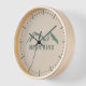 A wall clock with mountains in green colors and customizable text on a light brown background for lovers of hiking and outdoor adventures. Just add a touch of nature at your office or home!