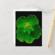 This postcard features a photograph of a Nasturtium flower. The photo has been artificially coloured resulting in dark green flower full of different tones that make it look both haunting and beautiful. The background is black.