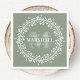 Floral Wreath Calligraphy Typography Monogram Napkin in Sage Green and White - Stylish green and white monogrammed napkin decor for a newly wed couple that features a custom monogram, groom & bride names, last name, and wedding date templates surrounded by a bold floral line art wreath. ©sweetwhimsypaperie