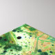 A dynamic abstract composition features an array of swirling shapes and patterns in various shades of green, black, and blue