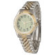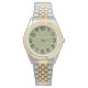 This omen's watch has an art deco design of three ovals broken across two very thin rectangles in camo green on a field of light green. Want the same design with different colors? Message me