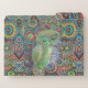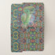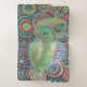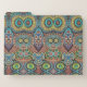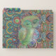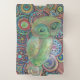 painting of a cute fuzzy green owl on a colorful red blue and purple patterned background make this playful file folder.