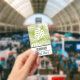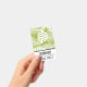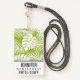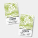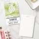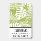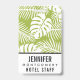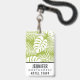 Name badgewith a repeating pattern of large palm leaves on an olive green background. Trendy modern and tropical. White space along the bottom to put your name and title.