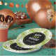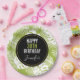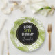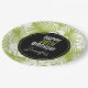 Personalized birthday paper plates with a repeating pattern of large palm leaves on an olive green background. A black circle with a gold border layered over top with your personalized details inside. Trendy modern and tropical.