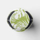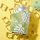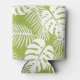 A can cooler with a repeating pattern of large palm leaves on an olive green background. Trendy modern and tropical.