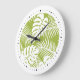 A clock with a repeating pattern of large palm leaves on an olive green background. Trendy modern and tropical.