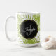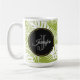 A mug with a repeating pattern of large palm leaves on an olive green background. Trendy modern and tropical. A black circle with a gold inner border layered over top with your personalized name and monogram initial inside.