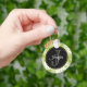 A keychain with a repeating pattern of large palm leaves on an olive green background. Trendy modern and tropical. A black circle with a gold inner border layered over top with your personalized details inside.