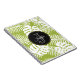 Spiral notebook with a repeating pattern of large palm leaves on an olive green background. Trendy modern and tropical.A black circle with a gold inner border layered over top with your personalized details inside.