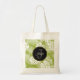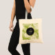 A personalized tote bag with a repeating pattern of large palm leaves on an olive green background. Trendy modern and tropical. A black circle with a gold border layered over top with your personalized name and monogam inside.