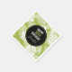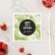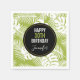 Party napkins with a repeating pattern of large palm leaves on an olive green background. A black circle with a gold border layered over top with your personalized birthday details inside.