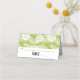 A folded table card for space for you to handwrite names and table numbers. Created with a repeating pattern of large palm leaves on an olive green background. Trendy modern and tropical.