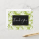 A thank you postcard with a repeating pattern of large palm leaves on an olive green background. Personalized message on the back.