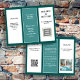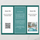 Any business, teal green and white tri-fold business logo brochure. Customize six sections, three front and three back with white and black text. Fonts are printed, along with easy to read script. Include a QR code and logo image. Add a personal photo or business photo to side two. Lots of text space for business hours, about section, and shop location. Fold after purchase into thirds. Double check all text as it will not be proofread before printing.