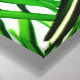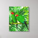 Canvas in an illustration of an affectionate pair of green and red parrots on a bamboo perch against a background of jungle foliage