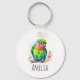 Personalized keychain with a cute parrot illustration. A little green parrot with blue and yellow colors blending together. Neck has a vibrant shade of reddish pink.