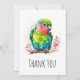 Thank you card with a cute parrot illustration. A little green parrot with blue and yellow colors blending together. Neck has a vibrant shade of reddish pink.