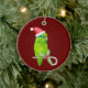 A watercolor of a green parrotlet. He is perching comfy on one paw. He is perched on top af a candy cane. He is ready for Christmas wearing a Christmas hat. There are holly decorations. Parrotlets are the smallest parrots.