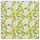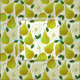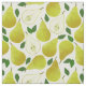 A pattern of vibrant green pears in shades of yellow and green with bright green leaves. Some of the pears are halved to show the juicy insides and seeds.