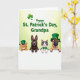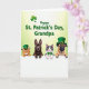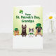 This design shows four cuddly pets—two cats and two dogs—peeking over a bright white ledge as if they’ve gathered close to share a sweet hello 💚. Behind them is a rich emerald-green background with a soft glow centered in the middle, giving the scene a cozy spotlight effect. Near the top sits a shamrock emblem ☘️, anchoring the holiday theme above their heads. Across the upper area, green lettering reads “Happy St. Patrick’s Day, Grandpa,” spaced above the pets so the message feels like it’s floating over their little crowd. On the left, an orange tabby with vivid blue eyes wears a green top hat, leaning in with a curious, affectionate look. Beside it, a pug in an even larger green top hat adds a funny, gentle seriousness, while a dark-coated dog looks forward with an easy, friendly gaze that feels like an invitation to come closer. On the right, a grey-and-white cat finishes the lineup in a green bow tie, its neat accessory standing out against the white ledge and green backdrop.