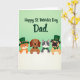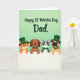 This card shows a quartet of animated pets—an orange cat, a brown dog, a grey-and-white cat, and a pug—peeking over a wide white bar across the bottom, their paws draped over the edge as if leaning in close like old friends. Behind them, a lime-green gradient background fills the scene, giving the whole design a fresh St. Patrick’s Day look 💚. The orange cat and the pug wear small green leprechaun hats with gold buckles, adding a fun nod to Irish folklore ☘️. The brown dog has a green collar with a matching buckle, and the grey-and-white cat wears a neat green bow tie, making them look like a coordinated little group. Their forward-facing eyes and slightly tilted heads create a cozy, affectionate moment, like they’re gathering together to greet someone special. The message “Happy St. Patrick’s Day Dad.” sits prominently on the white bar in dark green lettering, centered and easy to read. The pets’ paws overlap the top edge of the bar, with their hats and accessories standing out against the soft green background.