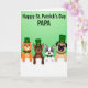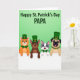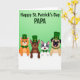 Designed with a spring-green gradient background, this St. Patrick’s Day card shows four cartoon-style pets peeking over a wide white strip near the bottom. Two cats and two dogs rest their front paws on the edge, leaning in as if they’re eager to share the moment with “Papa” 💚. An orange cat, a dark-brown dog, a gray-and-white cat, and a tan dog with a short snout line up shoulder to shoulder, each wearing a tiny green top hat with a gold buckle and a matching green bow tie or collar. Their wide, shiny eyes and soft smiles create a sweet, friendly closeness, like a little family huddle. Across the upper area, the message “Happy St. Patrick’s Day PAPA” appears in dark green letters, centered and easy to spot. The simple shapes and flat shading keep the focus on the pets’ affectionate expressions and festive outfits ☘️. The white strip stays blank and bright beneath them while the green background fades lighter toward the top, framing their hats and paws. Share St. Patrick’s Day sentiments with someone special, and enjoy the four little faces lined up above the crisp white band.