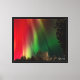 Red northern lights over snowy trees.