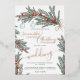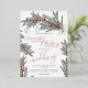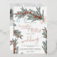 Time to celebrate your winter wonderland wedding theme with this hand painted green pine branch, red mistletoe, Christmas ornaments featuring a modern cool script font typography. Add or remove your photo at the back with the couple's names. With real rose gold foil.