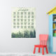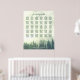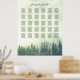 This wedding seating chart features a rustic yet elegant design with a green forest of mountain pine trees shrouded in mist or fog. The title reads "please find your table" in elegant lacy script calligraphy. There is space for the couple's names and wedding date. This chart has table assignments for 300 guests in a traditional arrangement of 10 people per table. Perfect for a woodland, outdoor or wilderness destination wedding.