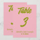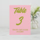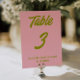 Modern and elegant colorful pink and green wedding table numbers. As you see it features a pink background with bold olive green script that matched the whole suite.
