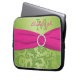 This personalized green floral damask laptop sleeve with a hot pink FAUX ribbon and crystal brooch has text boxes for you to customize with your own name, initials, business name, or other text. If you need any help customizing, please email niteowlstudio@gmail.com.