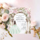 A large marble arch decorated with pink florals. A girl with a green dress. Personalize and add a name and details.