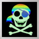Light green skull and crossbones with dark blue eyepatch and bright rainbow bandanna. Simple colorful pirate skull design for Halloween or anytime. Background and border colors are customizable.