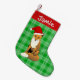 Bright green plaid and fox wearing Santa hat on personalized Christmas stocking.