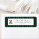 Green plaid patterned Christmas return address label design with a cute teddy bear illustration.