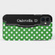 Stylish iPhone 5 case designed with a white polka dots over green pattern, a black frame over the left side, and personalized with your name or custom text in white across the black frame. This design is perfect for vertical and horizontal use of the iPhone 5.