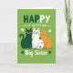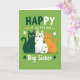 This card shows three cartoon cats sitting close together, their bright yellow eyes turned toward each other with soft smiles that feel like a shared inside joke between friends 💚. In the middle is a deep emerald green cat, flanked by a white cat covered in small green polka dots and a cozy ginger cat, all lined up neatly as if posing for a photo. The background is a rich green field that sets a St. Patrick’s Day scene, with the cats’ warm expressions standing out against it ☘️. Across the top, the phrase “HAPPY ST. CATTY’S DAY” is placed in rounded, light-colored letters that pop clearly against the green. Near the bottom, “Big Sister” appears with small shamrocks beside it, making the dedication feel close and affectionate without needing extra decoration. The trio’s bodies overlap slightly, and their tails and paws tuck in toward one another, adding a gentle, companionable closeness to the arrangement. Small yellow arrow shapes sit to the left and right of the main text, pointing inward toward the cats and tying the layout together.