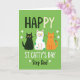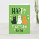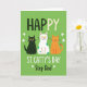 Designed with a St. Patrick’s Day theme, this digital illustration features three stylized cats sitting side by side on a saturated lime-green background 💚. On the left is a sleek black cat, in the middle a white cat covered in green polka dots, and on the right a warm ginger cat, their forward-facing poses giving them a friendly, together-at-the-party look. Small white shamrocks are scattered across the green field, adding a light sprinkle of holiday detail ☘️. At the top, the word “HAPPY” appears in large white letters, centered and easy to spot. Beneath the cats, “ST. CATTY’S DAY” is set in the same white lettering, stretching across the width like a headline under their paws. Along the bottom, “Step Dad” is written in a flowing white cursive style, tucked neatly under the main phrase. The cats’ simple shapes, contrasting fur colors, and the repeating shamrocks stand out sharply against the bright green backdrop.