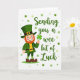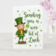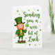 This greeting card features a friendly, humanlike leprechaun standing on the left, dressed in a tall green top hat with a gold buckle, a green jacket, and a wide gold belt. His rosy cheeks and bright smile sit under a tidy red beard, giving him an inviting look that feels like he’s sharing a private joke with someone close. In his right hand, he holds up a bright green four-leaf clover ☘️, angled toward the reader like a small gift. On the right side, the message “Sending you a wee bit of Luck” appears in an elegant, flowing emerald style, centered vertically to balance the character. The white background keeps everything airy, while scattered green polka dots in different shades add motion around the figure 💚. Green, gold, and red details stand out sharply against the white, drawing your eye from his hat down to his striped green-and-white socks and brown shoes. The dots vary in size and tone, with clusters drifting behind the text and around the leprechaun’s shoulder.