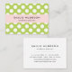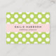 Cute, fun and adorable business cards with polka dot pattern in green and white color. Modern and trendy design, perfect for polka dots lovers.