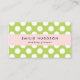 Cute, fun and adorable business cards with polka dot pattern in green and white color. Modern and trendy design, perfect for polka dots lovers.
