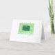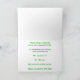Painting of a green present topped with a green and white striped bow, on an abstract patterned background of yellow, green, and white, is printed on custom greeting cards. The text for a Christmas exchange party can be customized for your own party, or deleted. There is text on the inside of the card too.