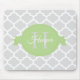 Add an elegant touch to your computer workspace with a Green Quatrefoil Personalized Mouse pad. Mouse pad design features a simple quatrefoil background and fancy emblem to personalize with your name and monogram. Additional items available with this design as well. Please contact me directly for assistance with personalization.